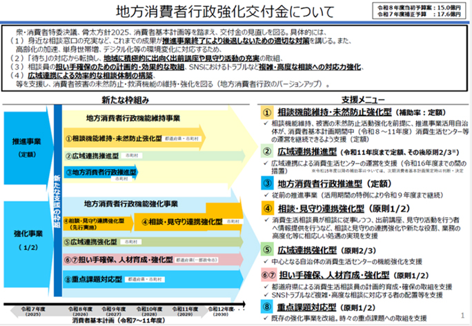 新たな枠組みの「地方消費者行政機能維持事業」は、これまで推進事業を活用していた自治体の取り組みが後退しないように支援するものです。