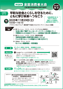 第64回全国消費者大会について » チラシPDFは こちら(506KB) 全国消費者大会はその時々の国民生活に寄り添い、協働の輪を広げてきた歴史を持ち、今回で64回を数えます。 開催日時 : 2025年11月29日(土)10:00〜16:10 開催形式 : プラザエフB2クラルテ(東京都千代田区)およびオンライン(Zoom) 定 員 : オンライン参加 300名、会場参加 60名 参 加 費 : 無料