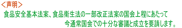 食品安全基本法案と食品衛生法の一部改正法案が政府提案として閣議決定され、今通常国会に上程されました。私たち消費者は、食衛法改正と充実強化を求める国会請願活動を始めとして、今日的な食品の安全を確保する社会システムを求める運動を進めてまいりました。私どもが各方面に要望してきた多くの点が反映された今回の両法案の成立について、期待を寄せています。
